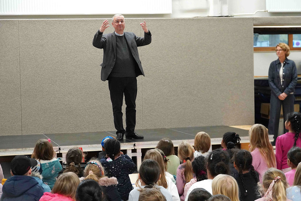 Bei Nieselregen und mit hochgeklapptem Mantelkragen schritt Erzbischof Stefan Heße am frühen Morgen über den Pausenhof. Der Start seines Besuches an der Katholischen Schule Hammer Kirche Ende vergangener Woche symbolisierte, was Hamburgs Oberhirte mit seinen regelmäßigen Terminen an den Schulstandorten einzufangen versucht: Einblicke in den normalen Alltag. Kein Ankommen mit Kinderchorempfang und vorbereiteten Statements, sondern Eintauchen in einen gewöhnlichen Werktag mit all seinen Herausforderungen, Chancen und Nöten. Und Schulleiterin Jenny Gromball, ihre Stellvertreterin Nathalie Dorison und die ganze Schulgemeinschaft ermöglichten genau das: Einblicke in die Vorschularbeit, Fragerunden mit interessierten Zweitklässlern, ungestelzte Austausche mit dem Kollegium und den Schülersprechern, eine umfassende Führung durch die renovierten sowie noch zu modernisierenden Räumlichkeiten und schließlich eine Begegnung mit der gesamten Schulgemeinschaft bei einem musikalisch-schwungvollen Abschluss-Happening in der neugestalteten Sporthalle.
